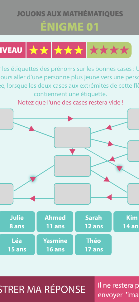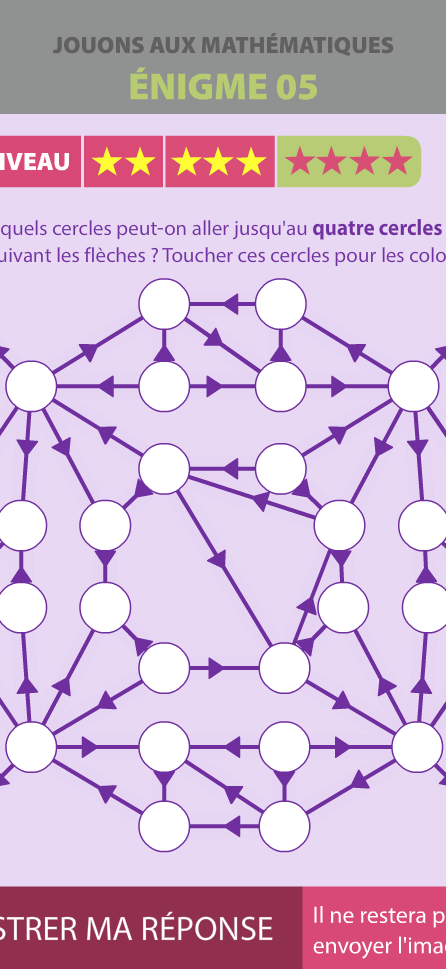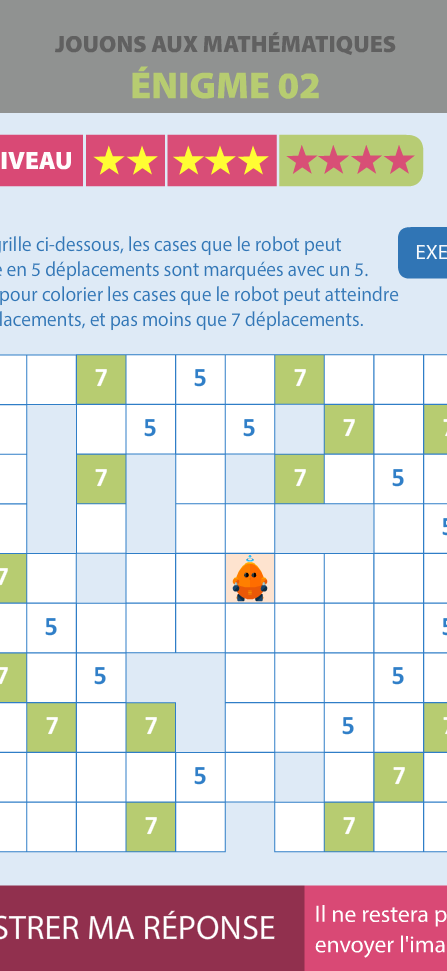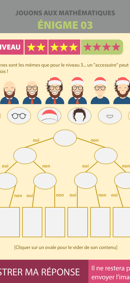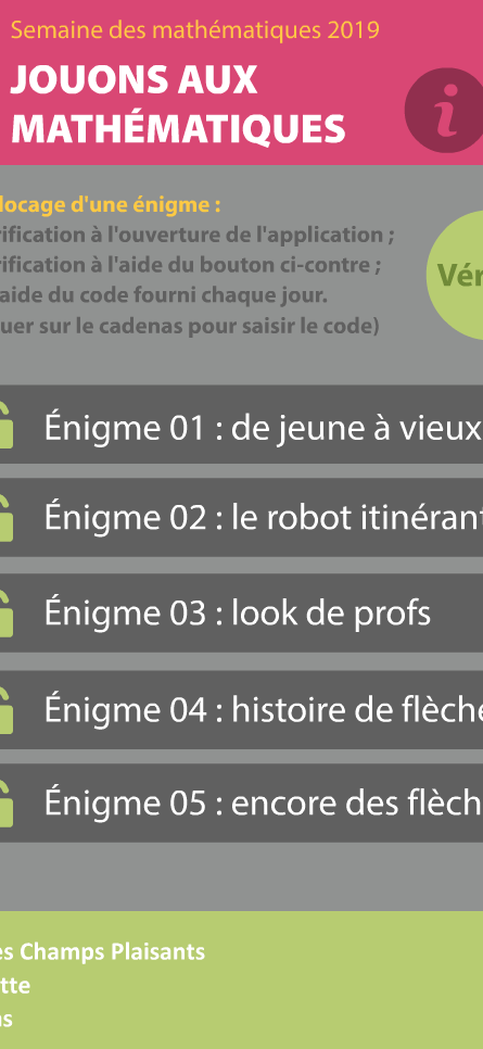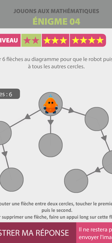L’application est constituée de 5 énigmes (une pour chaque jour) déclinées en trois niveaux de difficultés, et est utilisable aux cycles 3 et 4.