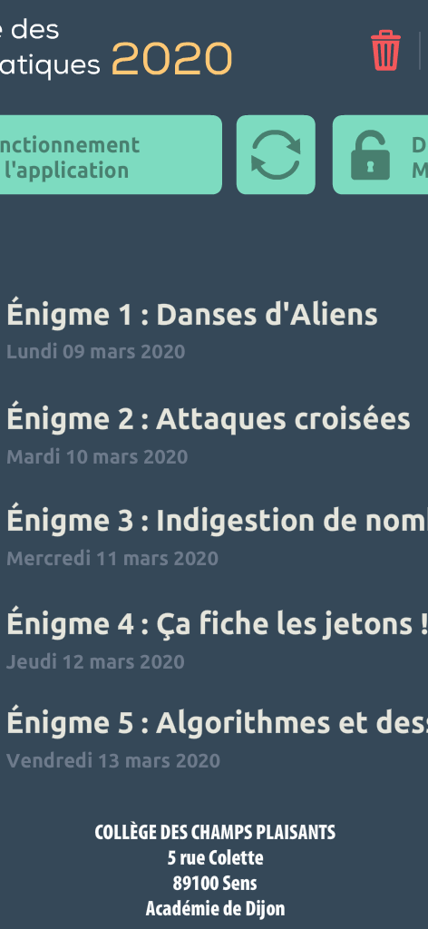 Les réponses doivent êtres transmises au(x) professeur(s) organisateur(s), mais pas à l’auteur de l’application ! La réponse à donner est sous forme d’une capture d’écran, à envoyer par mail à l’adresse indiquée dans l’organisation du concours d’énigmes. L’application ne propose pas de correction des réponses.