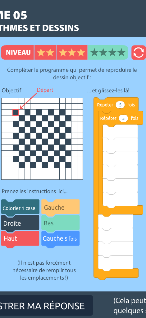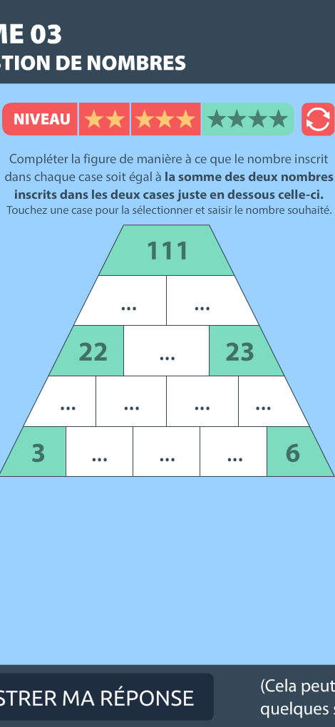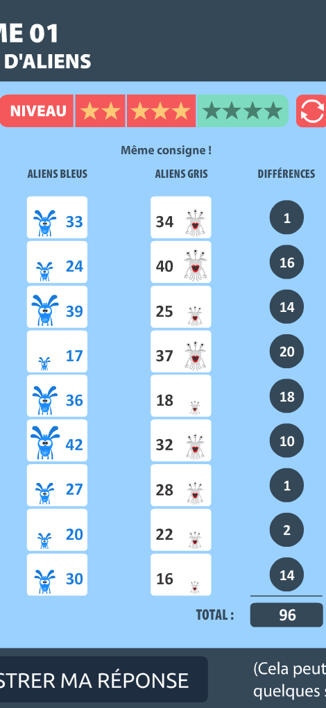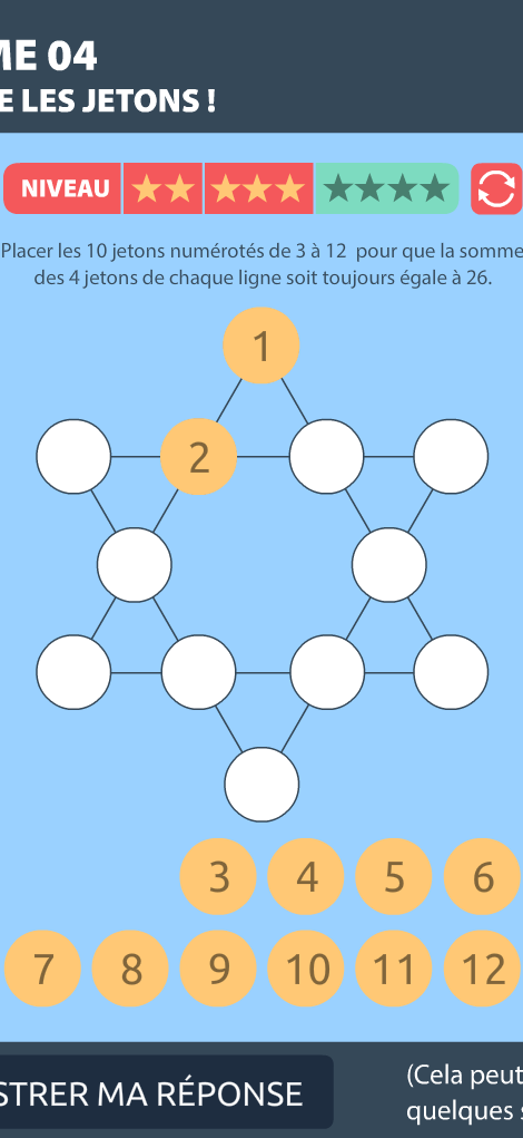 L’application est constituée de 5 énigmes (une pour chaque jour) déclinées en trois niveaux de difficultés, et est utilisable aux cycles 3 et 4.