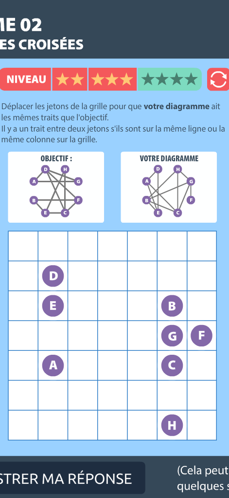 Les énigmes sont disponibles à partir du 09 mars 2020. Chaque jour, dès minuit, l’énigme quotidienne est déverrouillée et peut alors être résolue. Chaque énigme comporte trois niveaux de difficulté croissante. En général, le niveau 1 est facile et permet de saisir les manipulations à effectuer. Le niveau 3 est difficile pour des élèves de primaire, qui pourront le plus souvent résoudre le niveau 2.